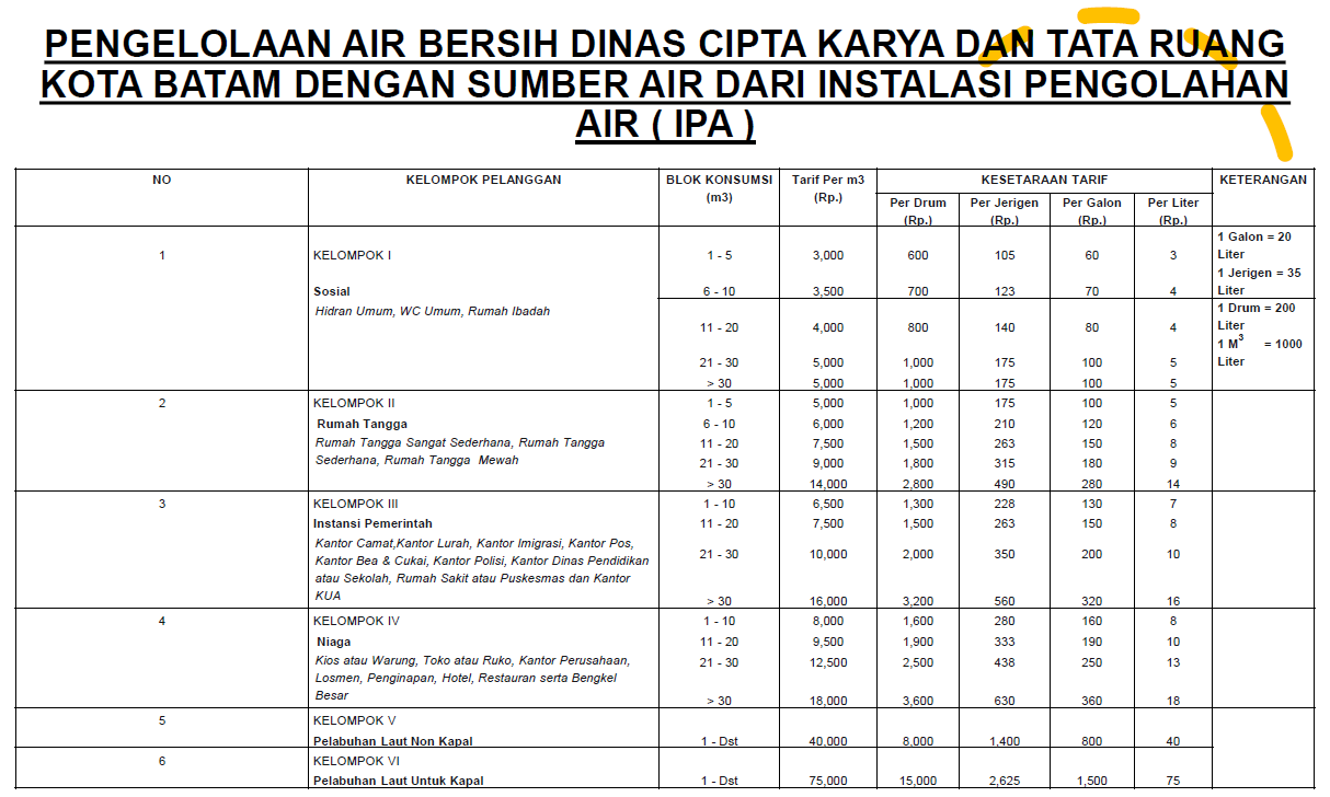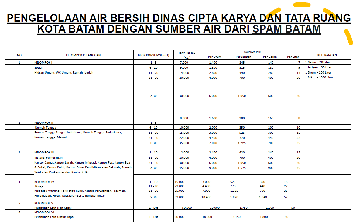 Berdasarkan Peraturan Walikota Batam Nomor 46 Tahun 2017 tentang Tarif Jasa Layanan Air Bersih dan Air Produksi SWRO Badan Layanan Umum Daerah (BLUD) Unit Pelaksana Teknis (UPT) Pengelolaan Air Bersih Dinas Cipta Karya Dan Tata Ruang, berikut daftar tarif dan ketentuan berlangganan yang berlaku.KETENTUAN BERLANGGANAN